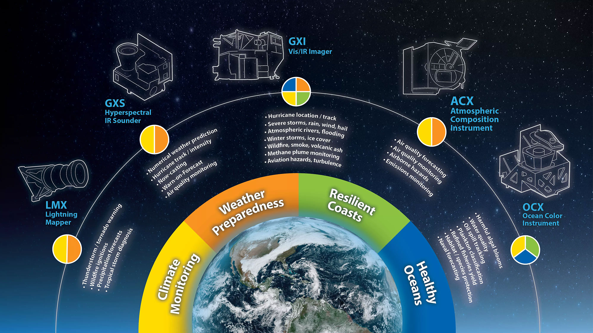Figure 1: The new intstruments and components of GeoXO, with the associated focuses in which they will improve forecasting and awareness.