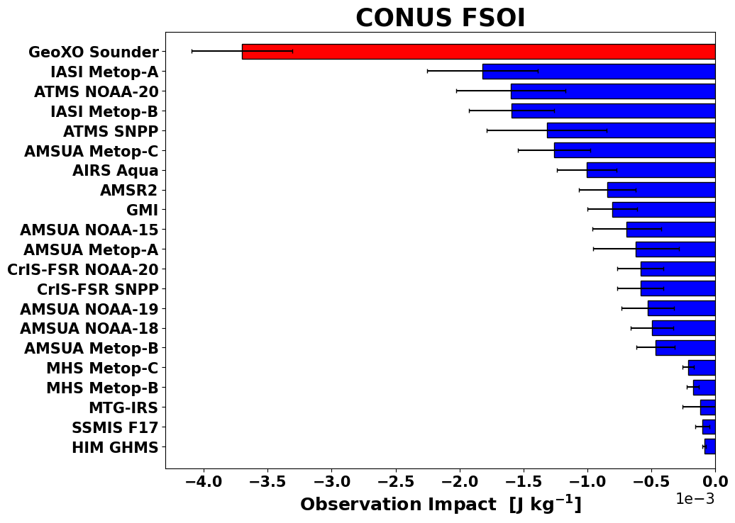 Figure 2: Observational error will be significantly reduced with the new instruments that will be part of the GeoXO overhaul. Negative values indicate a reduction in forecast error over CONUS, showing the GXS provides the largest beneficial impact of instruments.