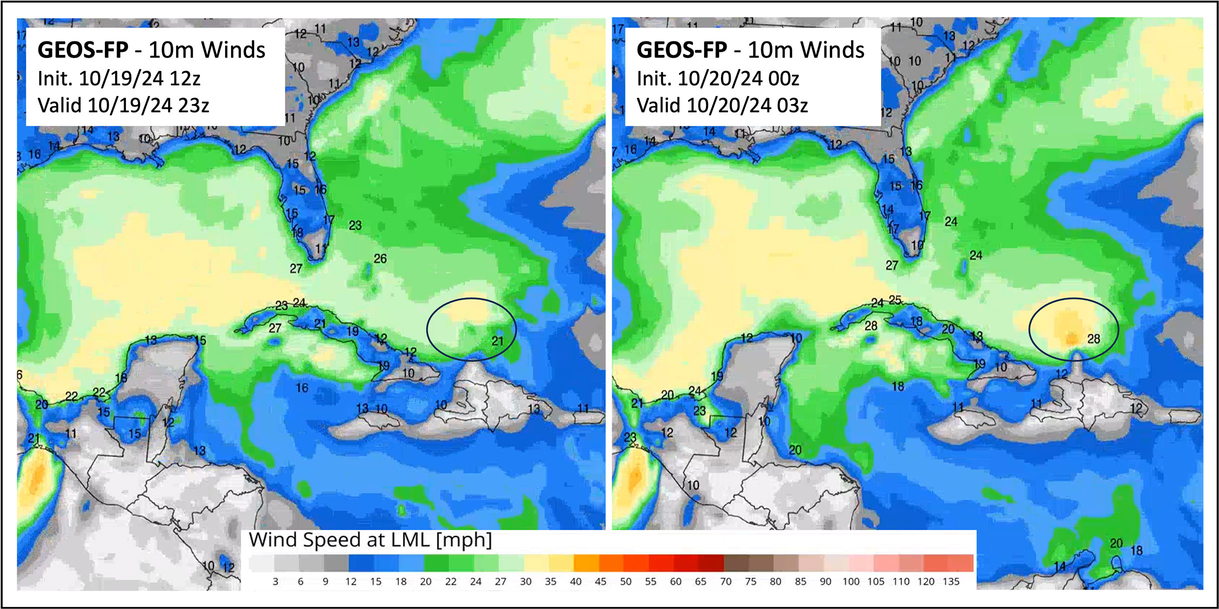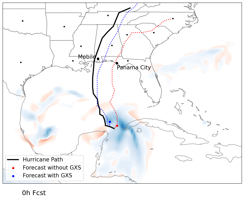 One recent example where GeoXO would have made an impact can be seen in Hurricane Oscar this past October. The smallest storm on record in the Atlantic basin, Oscar was too small for even the 0.25-degree GEOS-FP system to detect, if not for a LEO satellite that happened to pass overhead at the time of peak windspeed (Figure 3). Improved resolution of GEOS-FP provided by GeoXO's next-gen instrumentation would have allowed this storm to be resolved. Improvements to GEOS forecasting via GeoXO can be seen in the hypothetical hurricane forecast above, which plotted a simulated hurricane using existing (red) and GeoXO (blue) observational data.