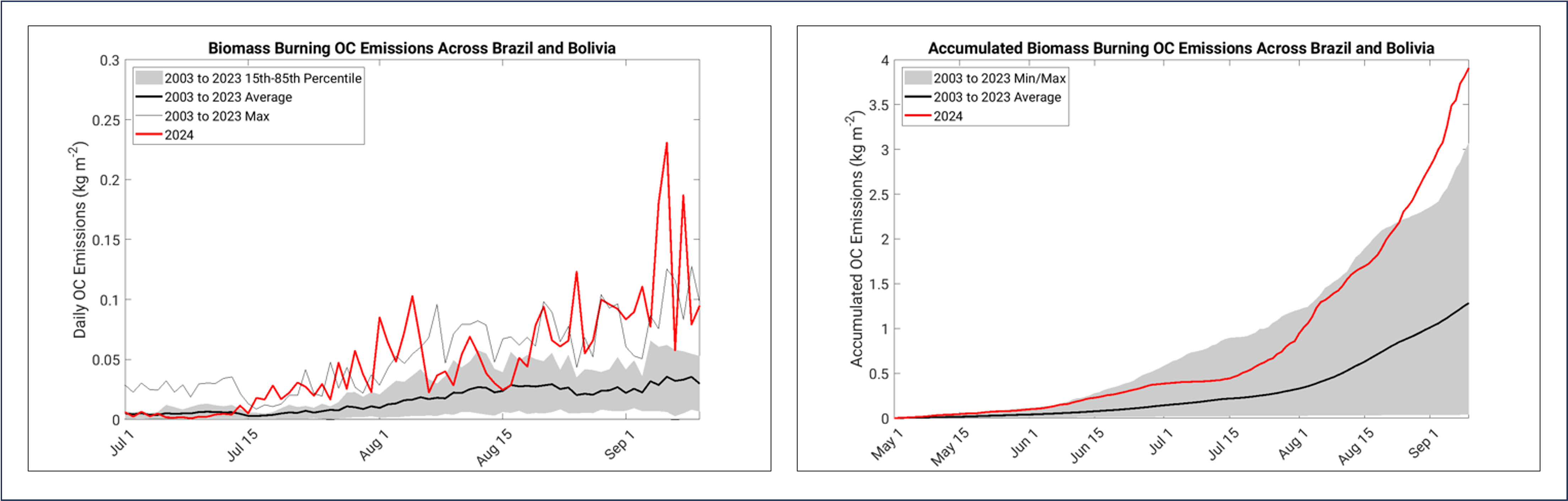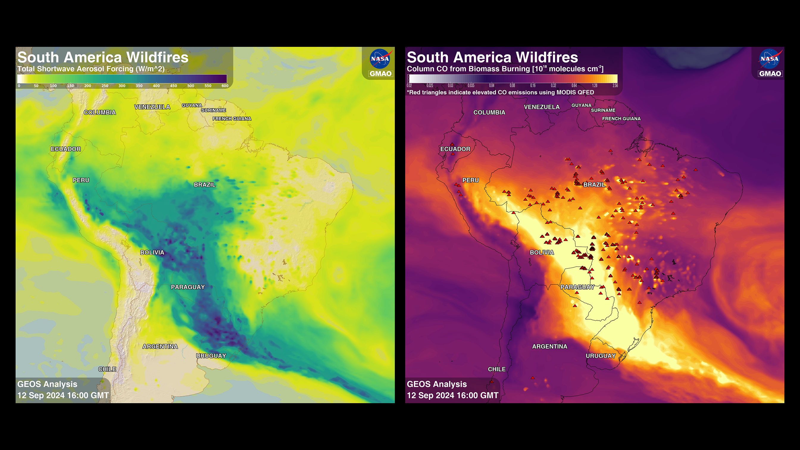 The animation below shows the progression of the 2024 fire season from June 1 through September 30 using GEOS Analysis. This video depicts both the diurnal cycle of shortwave forcing due to aerosols, and the high concentration of said aerosols as a result of biomass burning (though the left panel shows total shortwave forcing due to all aerosols, and the right panel only shows CO). The highest values are present in mid-August through mid-September. The combination of the size of the fires and prevailing winds resulted in smoke being transported both far distances and in high concentrations, making the fires' effects felt far from the actual sources. Though the peak of the 2024 fire season has passed, fires still persist in parts of South America.