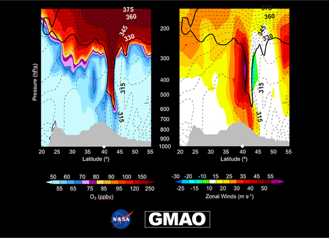 Stratospheric intrusions form as a result of the tropopause being drawn down below the jet stream (right panel). They lead to the mixing of stratospheric air with high ozone (O3) concentrations into the troposphere (left panel), causing ground-level O3 to exceed air quality standards, especially for communities at high elevations. With a 50-km horizontal resolution and its use of O3 profile information from the EOS-Aura MLS instrument, NASA’s MERRA-2 Reanalysis is able to capture the fine-scale features of an intrusion. This is a substantial advance on prior reanalyses.