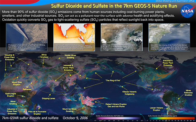 The 7-km GEOS-5 Nature Run (G5NR) includes these important constituents and produces a realistic distribution of their concentrations around the globe. SO2 can be seen streaming from industrial emissions throughout North America, Europe and Asia. Mining locations where metals are extracted from ore during smelting have a number of emission locations with major smelting sites over Russia, Africa, South America and Australia. Shipping lanes through the Indian Ocean and West Pacific can also be observed from SO2 emissions in the 7-km G5NR. Natural sources of SO2 from volcanic emissions can be seen throughout the "Ring of Fire" surrounding the Pacific Ocean, and from other significant eruptions including Mt Etna in Italy and the Rabaul Volcano in New Britain. Patterns of high SO4 fraction are associated with these anthropogenic and volcanic sources of SO2. While the highest concentrations of these pollutants can be seen surrounding primary emission sites, SO2 and SO4 can be exported over long distances within the prevailing winds of the global circulation of the atmosphere.