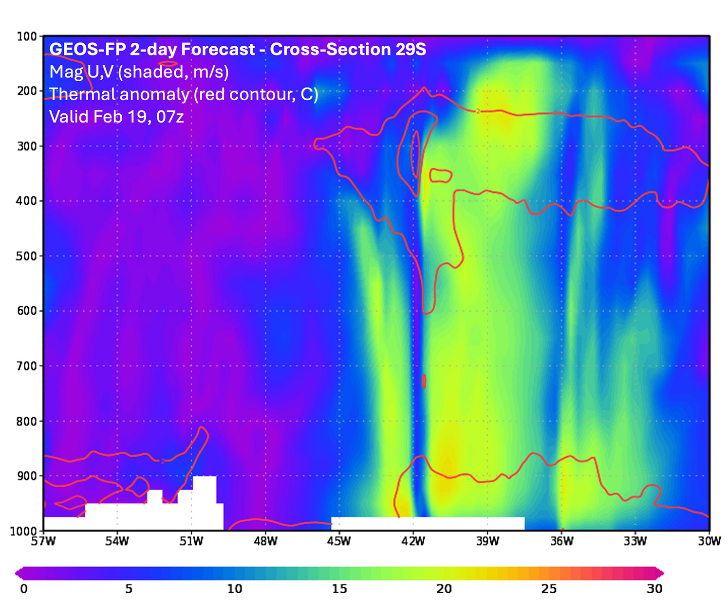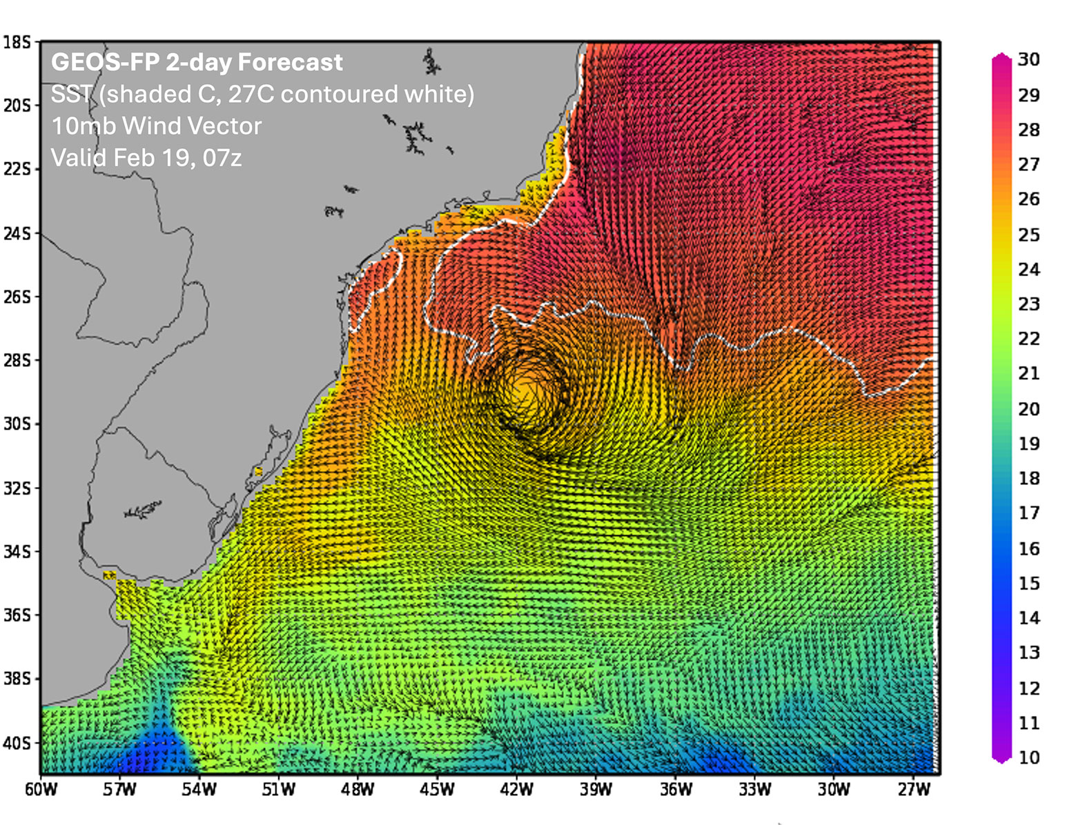The hallmark of a good numerical weather prediction (NWP) model is its ability to consistently provide accurate forecasts, especially ahead of unusual or high-impact weather events. Recently, NASA GMAO’s flagship NWP model, GEOS-FP, successfully did just that when it called for something unusual taking shape off the southeastern coast of Brazil. NWP models of just ten years ago could not have forecasted such an event. Consecutive GEOS-FP forecasts starting Feb. 15 indicated low-pressure would form in that area of the South Atlantic basin in about two or three days. While that’s not unusual, GEOS-FP accurately anticipated that this system would take on characteristics of being symmetric and warm-cored. In other words, a tropical cyclone. And, late in the day Feb.18, NASA satellites along with ocean surface wind scatterometry (ASCAT) indeed confirmed the presence of a South Atlantic tropical cyclone.